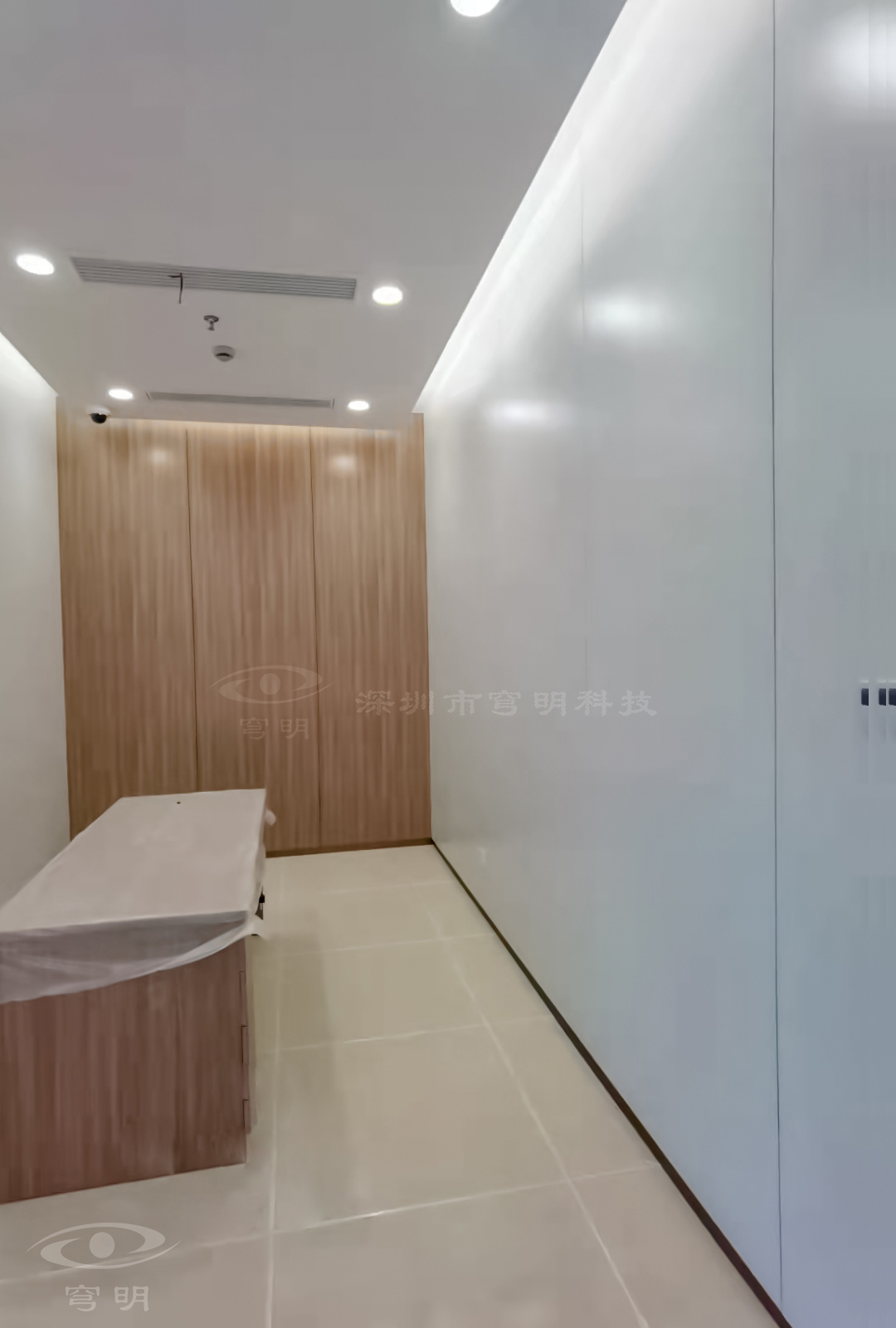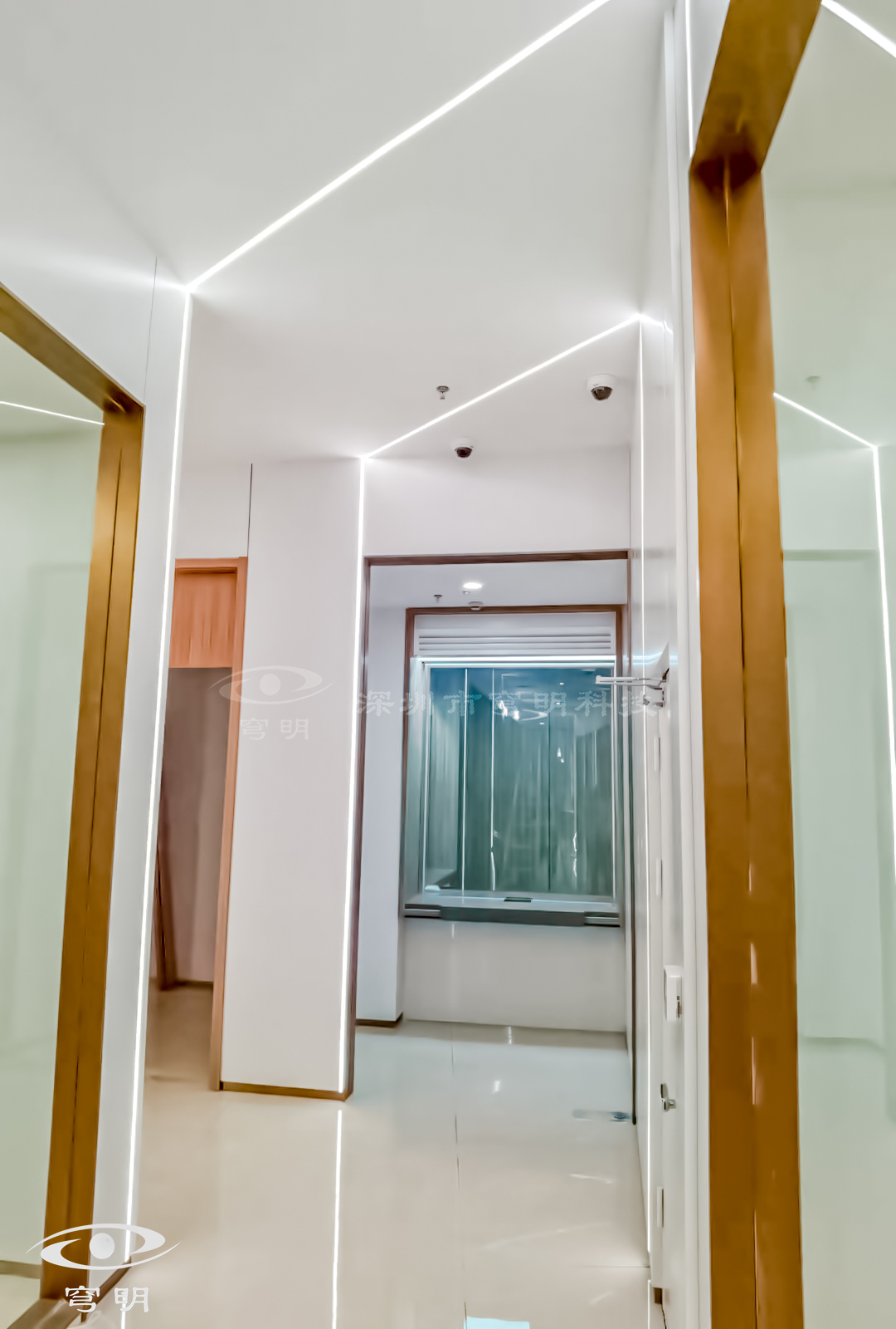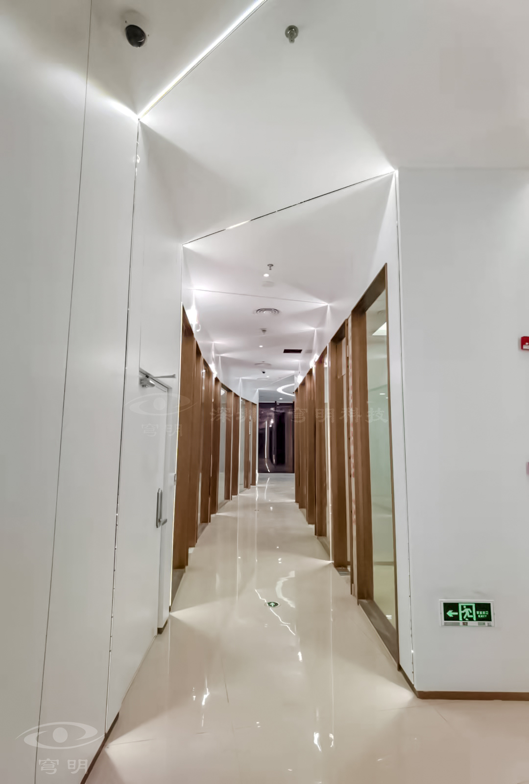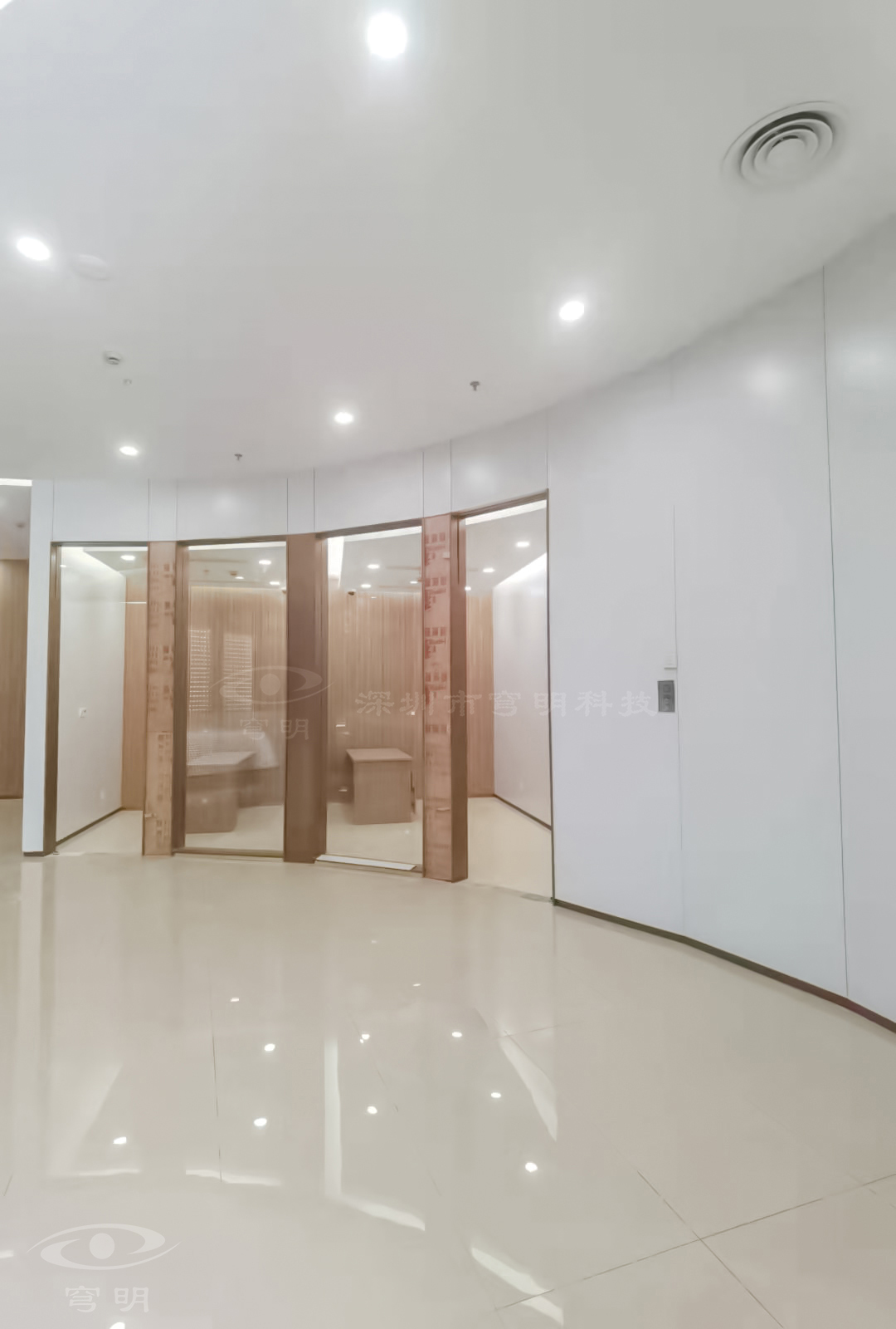 行政走廊以鏡面、陶瓷地板與sy849白色、紅豆杉木紋金屬?gòu)?fù)合板的碰撞融合,玻璃構(gòu)成空間的多維度,使觀者置身其中,產(chǎn)生時(shí)尚簡(jiǎn)約的共鳴。