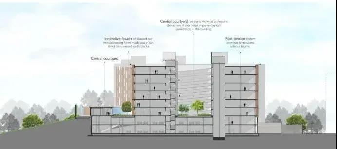 這有助于使部門保持獨(dú)立,從而在功能上保持每個(gè)樓層的無(wú)菌性。經(jīng)過精心的戰(zhàn)略規(guī)劃,該建筑試圖做出宏偉而又本地化的趨勢(shì),并注意磚砌藝術(shù)品和裸露的混凝土等細(xì)節(jié)。該項(xiàng)目是被動(dòng)設(shè)計(jì)和可持續(xù)性的典范。天然壓縮的,風(fēng)干的土磚(CSEB)是在現(xiàn)場(chǎng)生產(chǎn)的,用于創(chuàng)建具有箱形和深色陰影投影的雙層外墻,以減少熱量獲取。CSEB通過其自身的孔隙率及其在空腔墻和jaalis等元素中的使用,使建筑物能夠呼吸,從而使該結(jié)構(gòu)適應(yīng)該地區(qū)的氣候。這減少了內(nèi)部熱量獲取,從而實(shí)現(xiàn)了最大的熱舒適性,從而降低了能耗。這些磚塊是使用砌塊機(jī)在現(xiàn)場(chǎng)生產(chǎn)的,從而為當(dāng)?shù)厝颂峁┝烁嗟木蜆I(yè)機(jī)會(huì),并確保了最低的碳排放量。這是CSEB在如此大規(guī)模的項(xiàng)目中的首次使用。