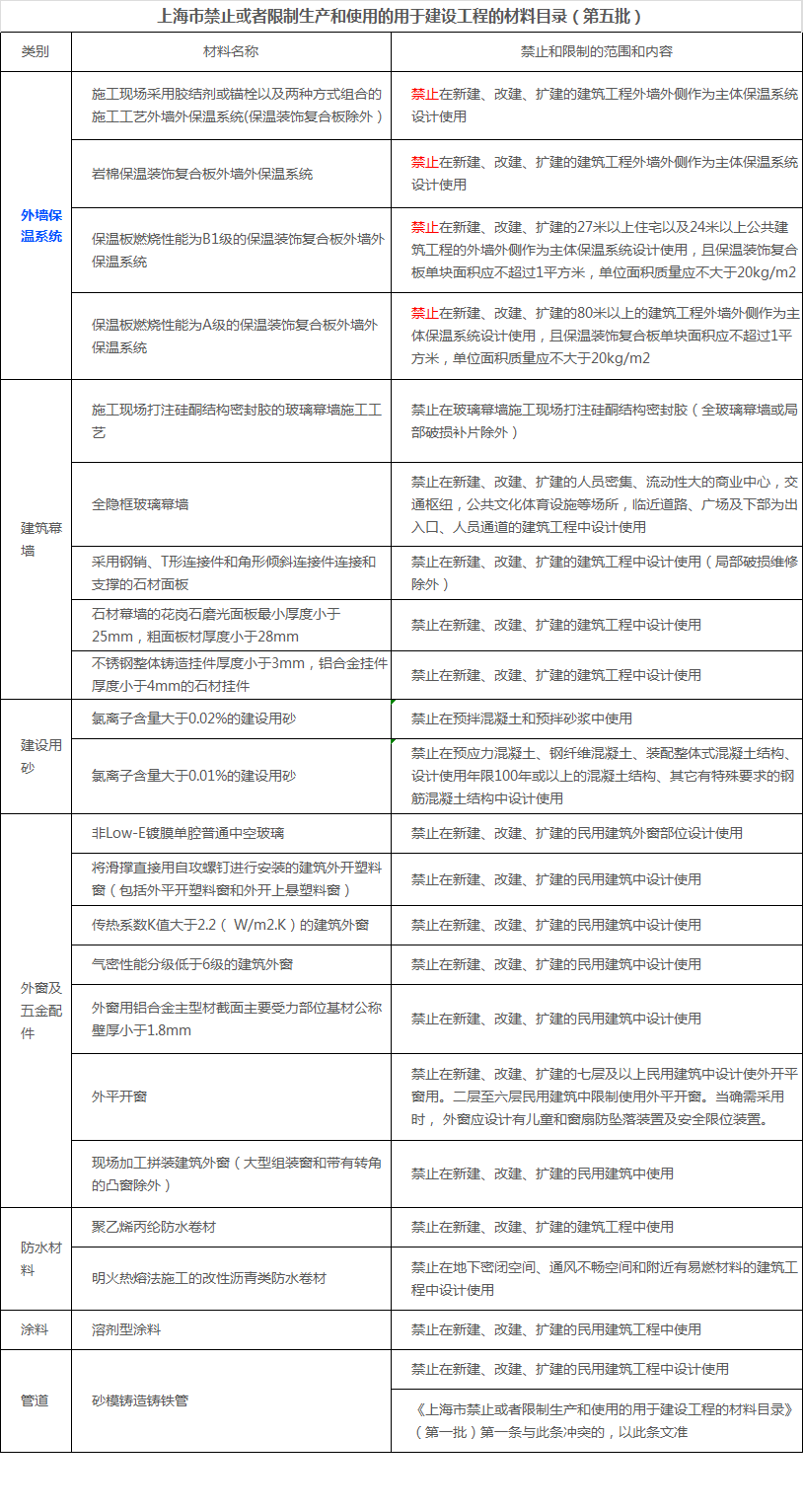 上海市住房和城鄉(xiāng)建設(shè)管理委員會(huì)公布了《上海市禁止或者限制生產(chǎn)和使用的用于建設(shè)工程的材料目錄(第五批)》。