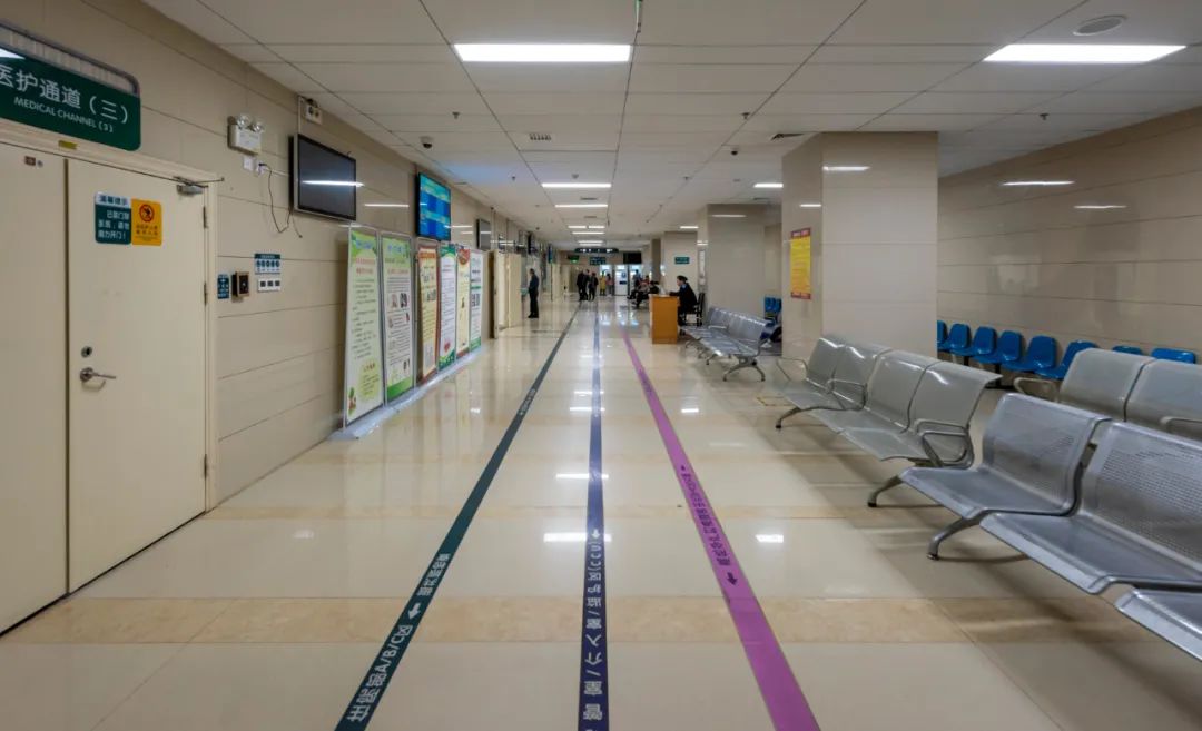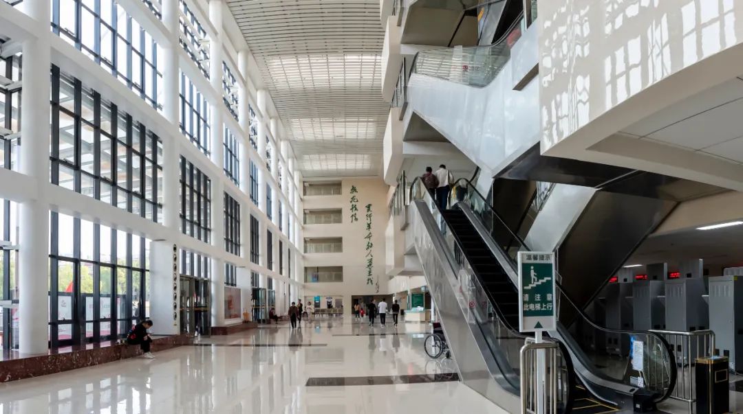 室內(nèi)的水平通道、垂直通道要從功能的分布、各醫(yī)療流程進(jìn)行梳理整合,選擇各種運(yùn)輸梯臺(tái)數(shù)量與形式,從而提高醫(yī)院的整體運(yùn)營(yíng)效率。圖為上海市第六人民醫(yī)院門(mén)診醫(yī)技樓垂直電梯廳。